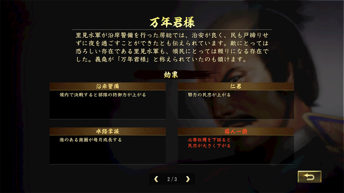 里見水軍を擁した史実の通り、海戦や水上決戦において、部隊の戦闘力が高まる。