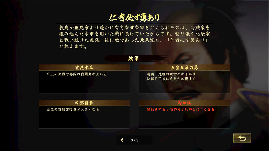 また、士気の自然回復量が大きくなり、周辺勢力に侵攻された際には、部隊の防御力が高まる効果や、決戦で傷ついた兵たちが義堯を慕ってすぐに戦線に復帰するなどの守備にも優れる。