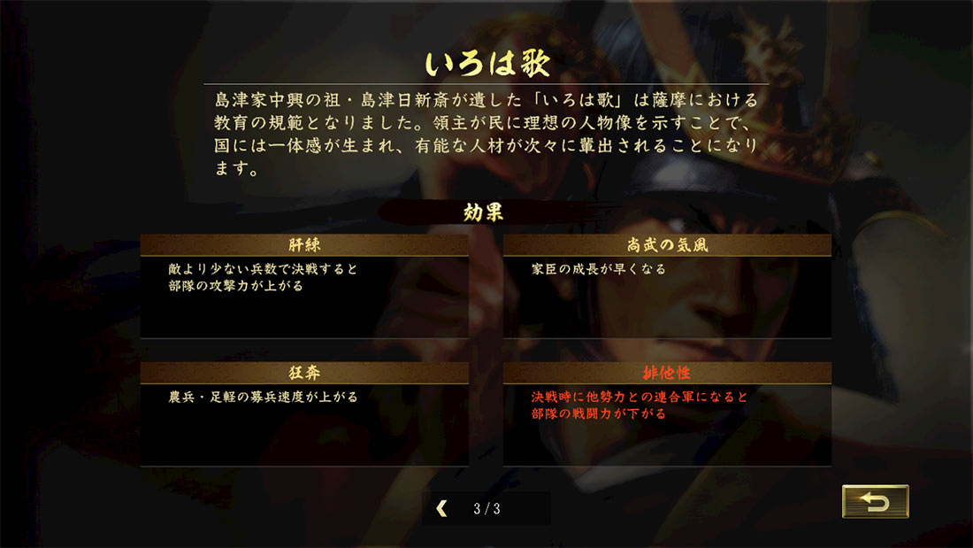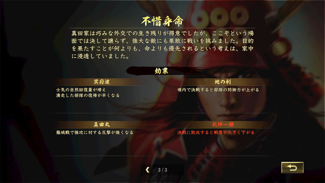 ただし、家中の結束が固い分、他勢力に敗戦を喫して一度勢いがくじけると、一気に勢力内の戦意が低下する傾向があり、戦争を挑む際には常勝が求められる。