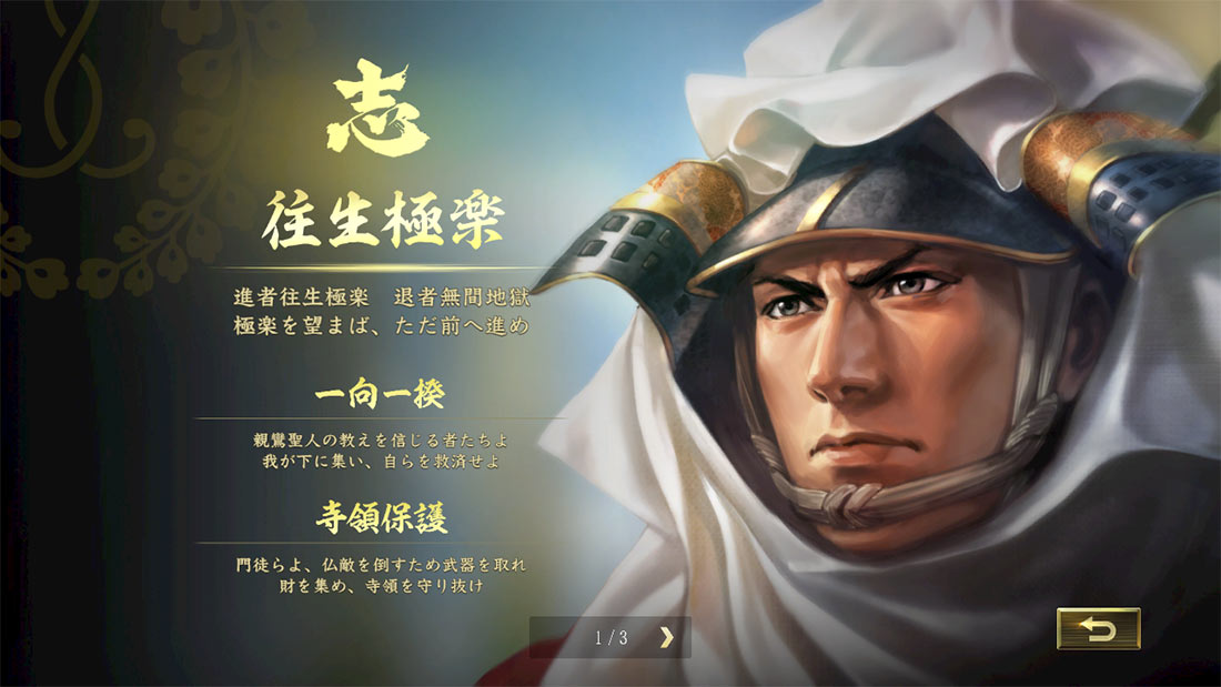 寺のある戦場では門徒たちがはせ参じ、兵数が一時的に増加。門徒たちは結びつきも強く、籠城戦では士気が下がりにくいうえに、攻城戦では包囲力が上がる。一方、敵勢力にすれば御仏を信仰する者を相手に戦うことになり、それを嫌って敵勢力の民忠は下がる。