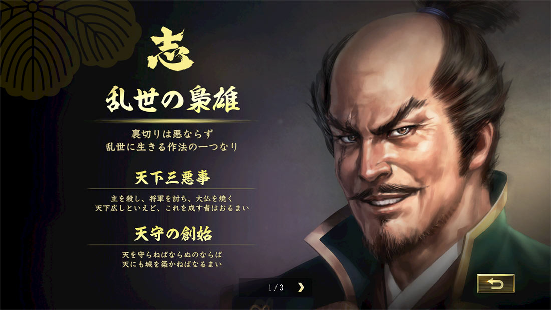 主君信長を三度裏切った久秀。大悪人のイメージを映した「天下三悪事」には、久秀ならではの効果が並ぶ。なかでも「二枚舌」は外交でおおいに役立ち、同盟を破棄しても他勢力の心証を下げない効果を持つ。同盟に利がなければすぐに手を切り、利の大きな勢力と結び直す。悪賢く戦国の世を渡っていけるのだ。