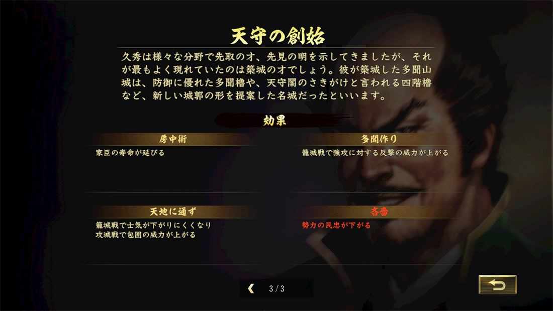 「天下の大悪人」と称される久秀にも別の顔がある。健康に気をつかっていた逸話から、松永家中には家臣の寿命が延びる「房中術」が備わっている。また、築城名人だったことから、籠城戦や攻城戦を優位に進められる効果も有している。