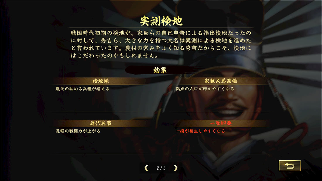 太閤検地を実施し、全国規模で田畑の面積と収穫量を調査した秀吉。その影響は多岐にわたり、「実測検地」では、兵糧収入の増加、足軽の戦闘力増加、拠点人口の増加、といった形で効果が表れる。兵糧と人口の増加で勢力基盤が厚くなるため、それを元に足軽主体で軍備を整えれば、盤石の体制となるだろう。