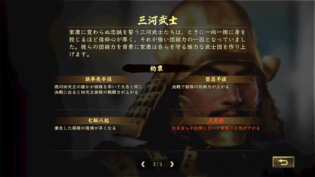 合戦で効果を発揮し、特に防御面に優れる。決戦で部隊の防御力が上昇し、潰走した部隊の戦線復帰も早いため、他勢力より粘り強い戦が可能だ。さらに「旗本先手役」の効果により、家康と徳川四天王(酒井忠次、本多忠勝、榊原康政、井伊直政)のいずれかがともに出陣することで、四天王の部隊の戦闘力が上昇する。