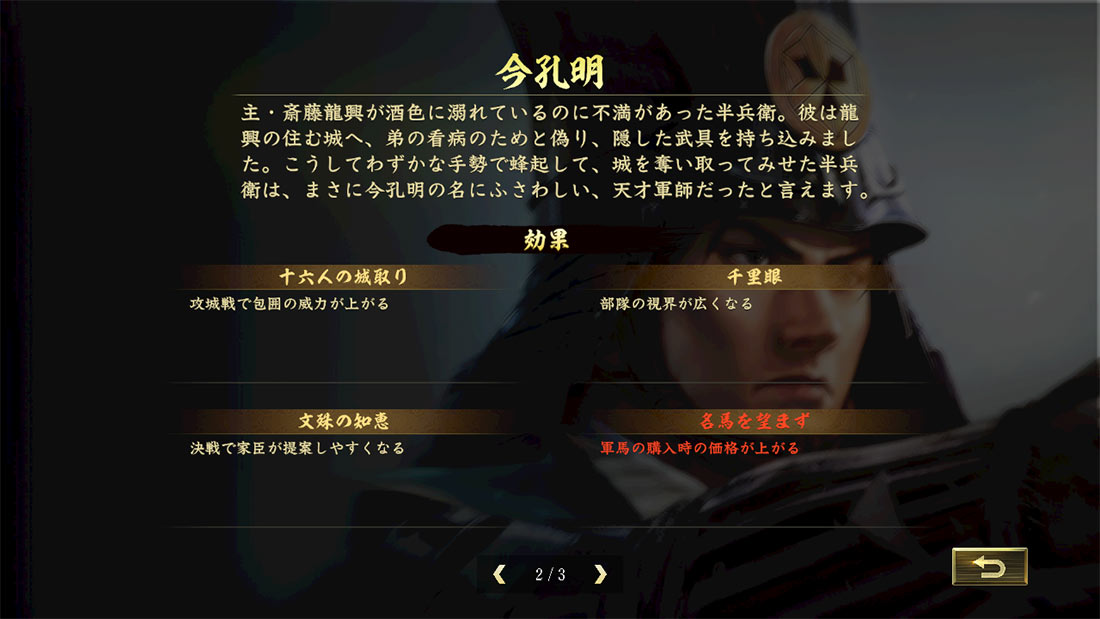 わずかな手勢で稲葉山城を奪い、秀吉の元では幾多の戦で軍師を務めた。その手腕から「今孔明」と称され、軍事に強い力を発揮する。「千里眼」で部隊の視野が広がるため、挟撃や待ち伏せといった敵の策を見破りやすく、攻城戦でも「十六人の城取り」の効果で包囲の威力が上昇する。