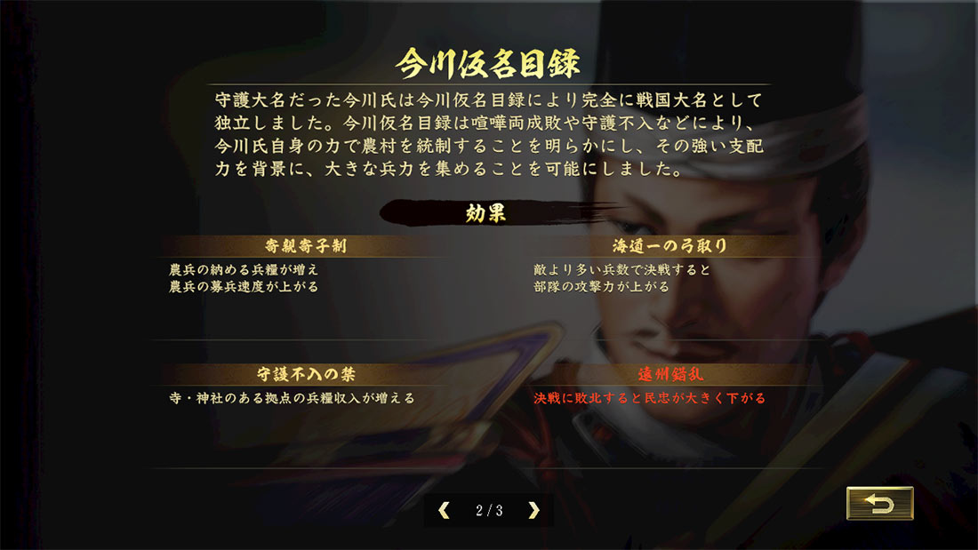 「寄親寄子制」により、農兵が納める兵糧が増加し、農兵の募兵速度も上がる。加えて「守護不入の禁」により、寺社周辺の拠点は兵糧収入がさらに増加。これらの相乗効果により、万全の備えをもって戦に臨めるだろう。しかし、桶狭間で義元が討たれた後、領地の遠江が大混乱をきたした史実から、決戦に敗れると民忠は大きく低下する。