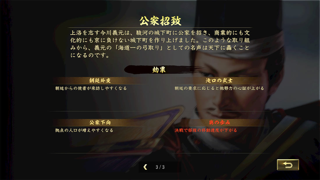 最大の利点は拠点の人口が増えやすいことで、兵糧(農民)と兵士(足軽)の確保、両面で効いてくる。さらには寺社や商人との結束が強く、それが収入増につながっている。ただし史実で今川家などの大勢力に政が左右されたことが、「目付役」の負の効果に表れている。