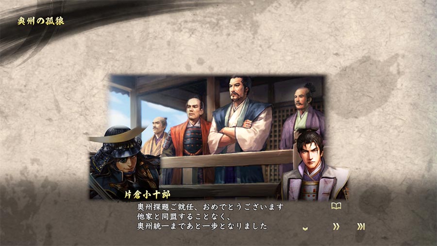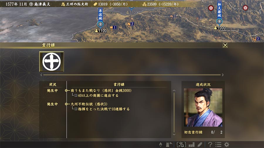 たとえば、東北地方で一度も他家と同盟を組むこと無く、敵勢力を滅ぼしていくと達成する言行録「奥州の孤狼」では、達成時の報酬として奥州探題を名乗ることができる。