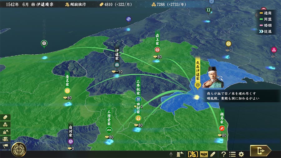 伊達家を取り巻く勢力のほとんどは「丸森伊達家(稙宗)」と味方しており、まさに四面楚歌といった状況だ。国力を十分に高めてから、他家を攻めようとする正攻法では、敵連合軍に袋叩きにあってしまうだろう。