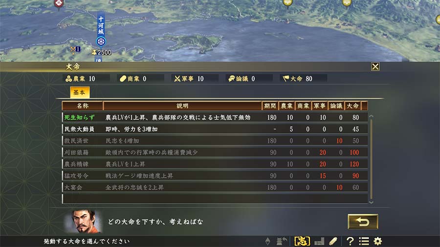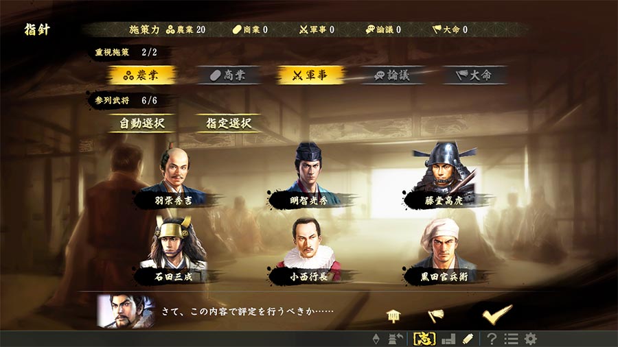 来る決戦に向け戦力強化を図る「大命」と、金銭収支で国力の地盤を固める「方策」。