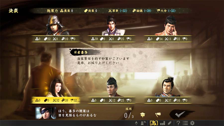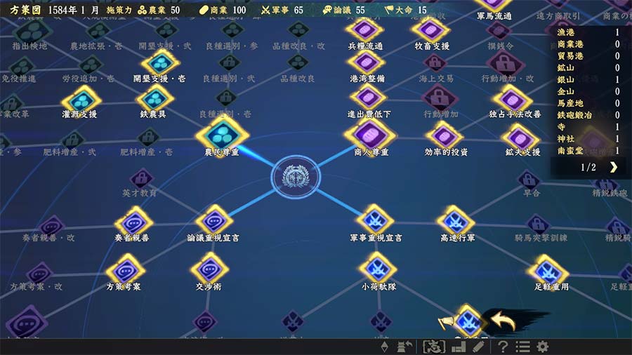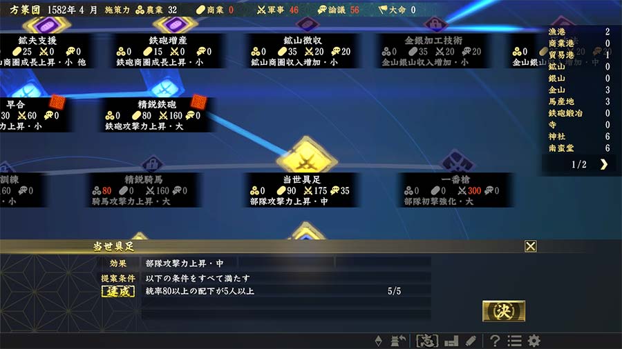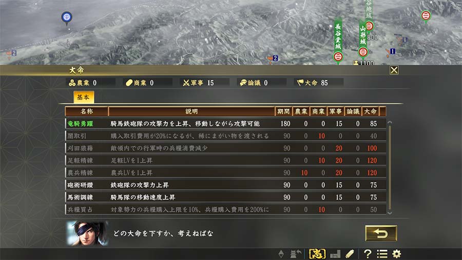 実行には「商業・軍事・論議」系統の「施策力」を大量に必要とするが、部隊の攻撃力を向上させる効果があり、長期的に考えると非常に有効だ。