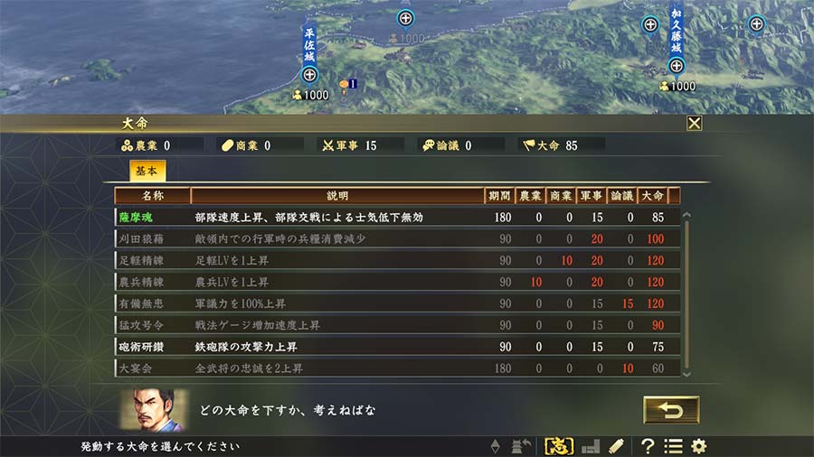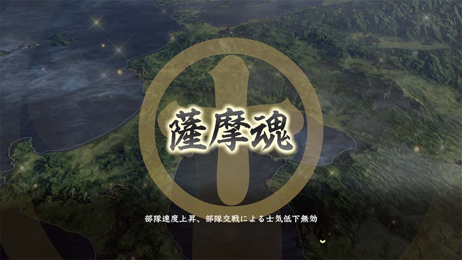 島津義久の大命「薩摩魂」は、部隊速度が上昇し、部隊交戦による士気低下を無効にできるという非常に強力な効果を持つ。