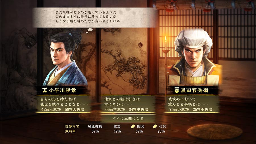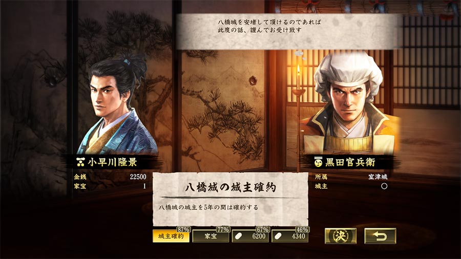 「密約」交渉ではまず「世間話」で印象を高めつつ、「城主確約」「家宝」「金銭」などの条件を提示する。敵将に対し、どこまでの見返りを用意するのか、ここもポイントの一つだ。