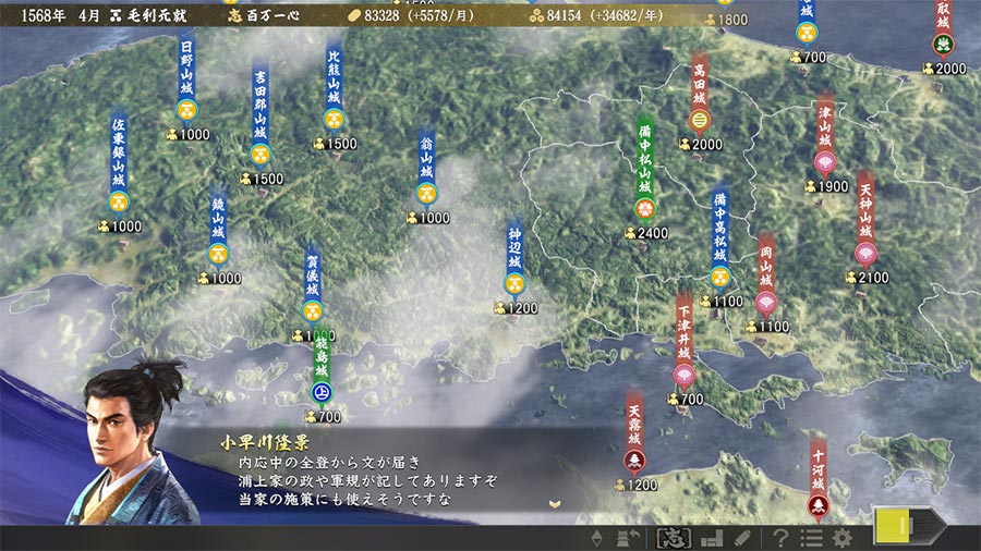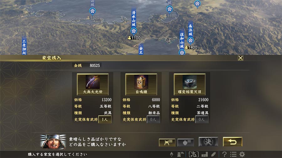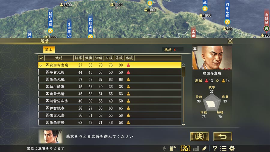 家臣に「家宝」を授与したり、「恩賞」として「感状」を与えたりすることで、忠誠を引き上げ、敵勢力からの調略に備えることができる。今作では商人が複数の家宝を持って売りに来るようになり、好きなものを購入できる。また、高価な「家宝」の代わりに、拠点を落とすごとに発行可能になる「感状」も重要な手段となる。どの武将に、どのタイミングで何を与えるかが人心掌握の鍵を握る。