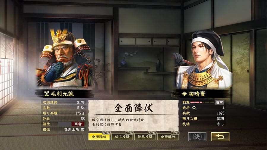 ▲ 交渉を持ち掛けて条件を提示。成功すれば被害を抑えて城を手に入れられるメリットが。