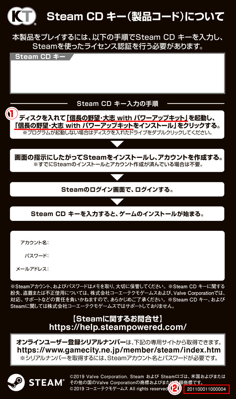 購入された『信長の野望・大志 with パワーアップキット』に封入されているSteam CD キーが「パワーアップキット」のものになっているお客様には、弊社ユーザーサポートにて正しいSteam CD キーを手配させていただきます。