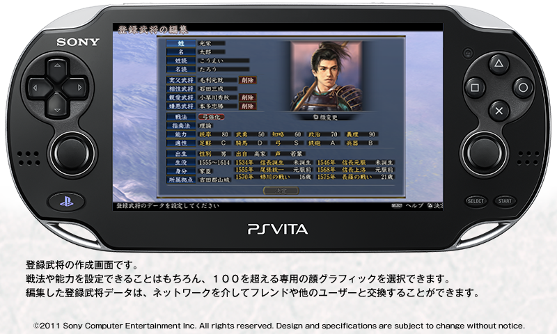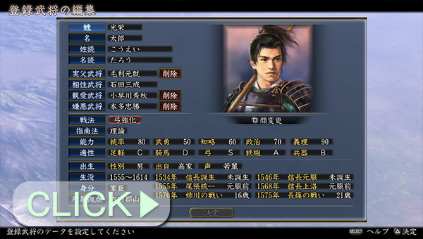 戦法や能力を設定できることはもちろん、100を超える専用の顔グラフィックを選択できます。編集した登録武将データは、ネットワークを介してフレンドや他のユーザーと交換することができます。