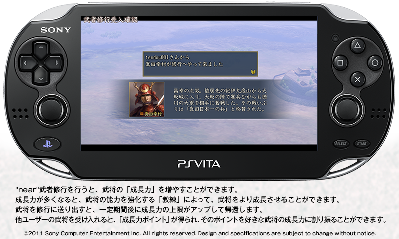 PS Vitaが持つ“near”のギフト機能により、お気に入りの武将を武者修行に出すことができます。
