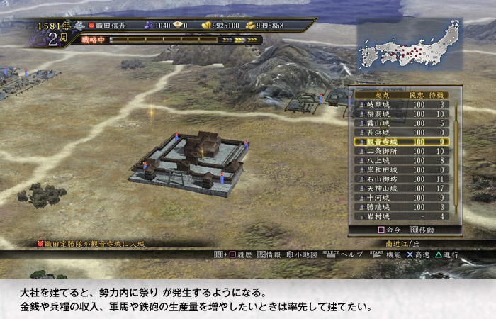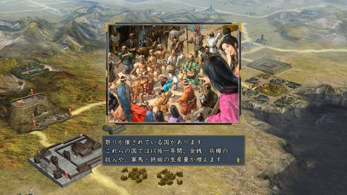 大社を建てた国で毎年9月に 祭り が発生し、一年間の金銭収入、兵糧収入、生産量が1.2倍になります。
