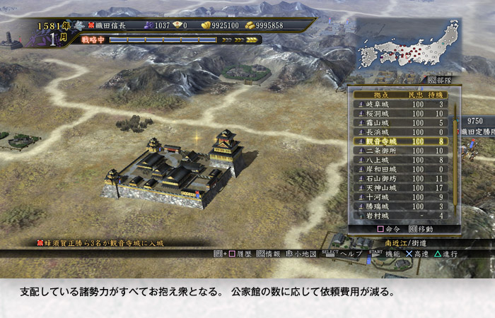 | 献上 | ― | 季節ごとに金銭収入の一部を朝廷に献上して 「貢献度」 を上げます。 この貢献度を消費して、さまざまな朝廷コマンドを実行します。 |