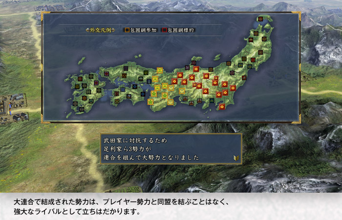 「大連合」を「あり」にしてゲームを進めると、プレイヤー勢力が強大になった時、周辺の敵勢力が連合を組み、一つの勢力となって対抗するイベントが発生することがあります。