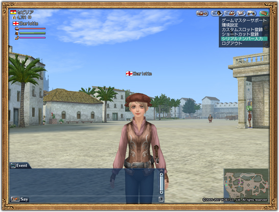 1)ゲームにログインして、画面右上メインメニューの「システム」から「シリアルナンバー入力」を選択します。