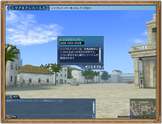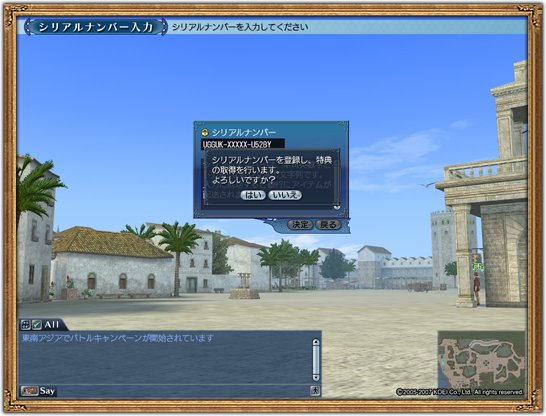 3)「シリアルナンバーを登録し、特典の取得を行います。よろしいですか?」というメッセージが表示されるので、「はい」を選択すると、「シリアルナンバーの入力に成功しました。特典が銀行に配送されました」というログメッセージが表示されます。
