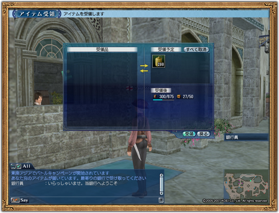 4)所持品にアイテムを受け取れるだけの空きを作った状態で、最寄りの銀行を訪れ、メニューから「アイテム受領」ボタンを押してください。