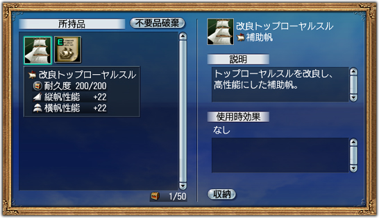 《改良トップローヤルスル》(補助帆):高性能な補助帆です。船に付けることで縦帆・横帆性能がアップします。