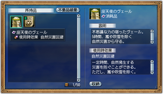 《座天使のヴェール》(消耗品):5時間、嵐や吹雪を除く自然災害から守ってくれるアイテムです。