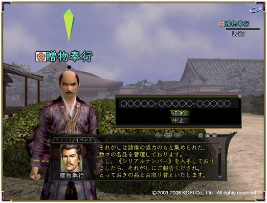 NPC“贈物奉行”に話し掛けると会話が進行し、シリアルナンバー入力画面が表示されます。