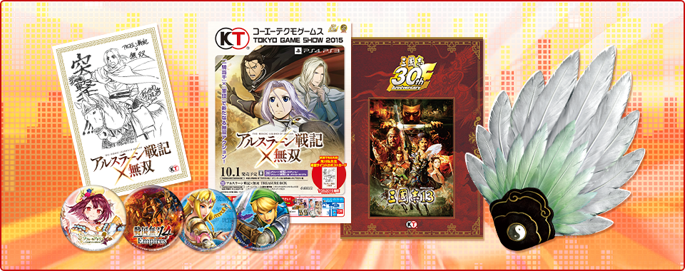 ●『アルスラーン戦記×無双』荒川弘先生複製サイン入りポストカード ●『三國志13』特製 “諸葛孔明”の羽扇 ●「三國志30周年」記念チラシ ●『ゼルダ無双ハイラルオールスターズ』オリジナル缶バッジ ●『戦国無双4 Empires』オリジナル缶バッジ ●『ソフィーのアトリエ』オリジナル缶バッジ ●コーエーテクモゲームス TGS2015 総合カタログ