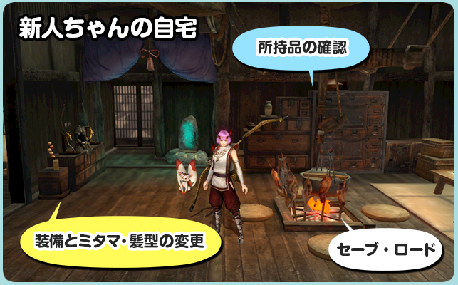 自宅ではセーブに加え、装備やミタマ、髪型の変更など
