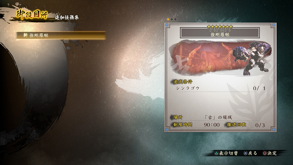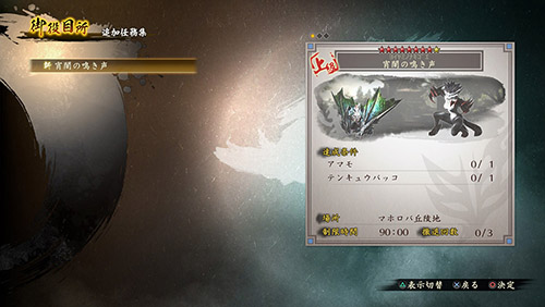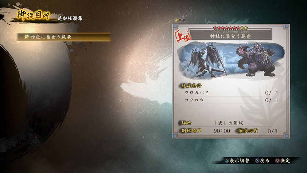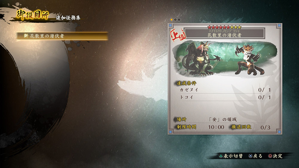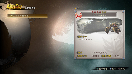 この任務の主な目的は、瘴気の影響で剛化・敏化したトコヨノオウを討伐することだ。しかし、朧“鬼”やコガネムジナの出現も報告されている。各地を歩き回り、発見し次第、急襲せよ!
