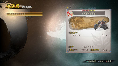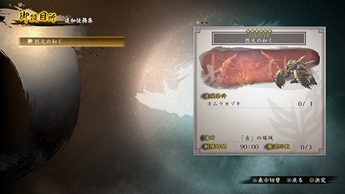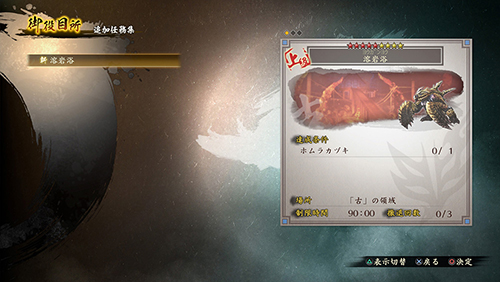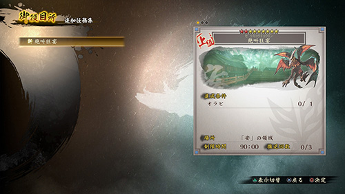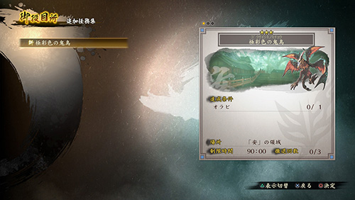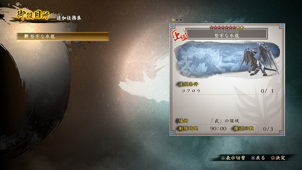凍て付く海原が、2体によって瘴気溜りと化した影響により、制限時間が少ない。武器・防具・ミタマを吟味し、敵を一気に撃砕せよ!