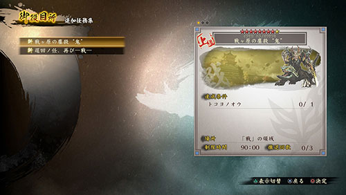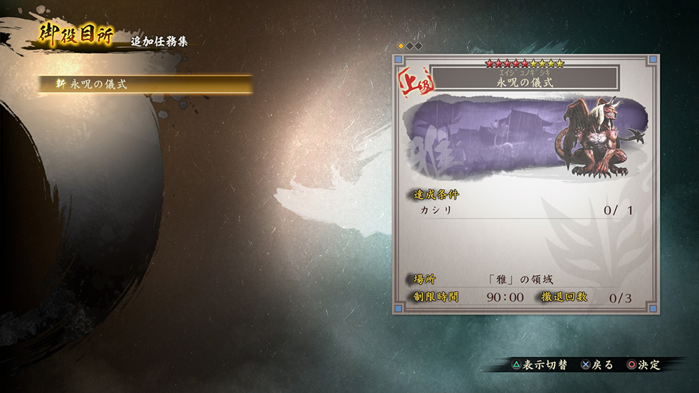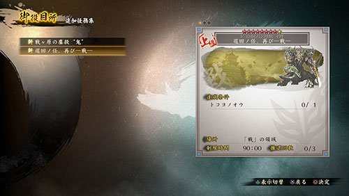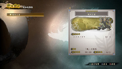 天空安土城・三の丸で、異界の彼方より来たりし“鬼”トコヨノオウが現れた。様々な属性攻撃を放つだけでなく、その威力も他の“鬼”を上回り、下手すれば一振りで命を落としかねない。今までの経験を十二分に活かし、この死闘に勝利せよ!