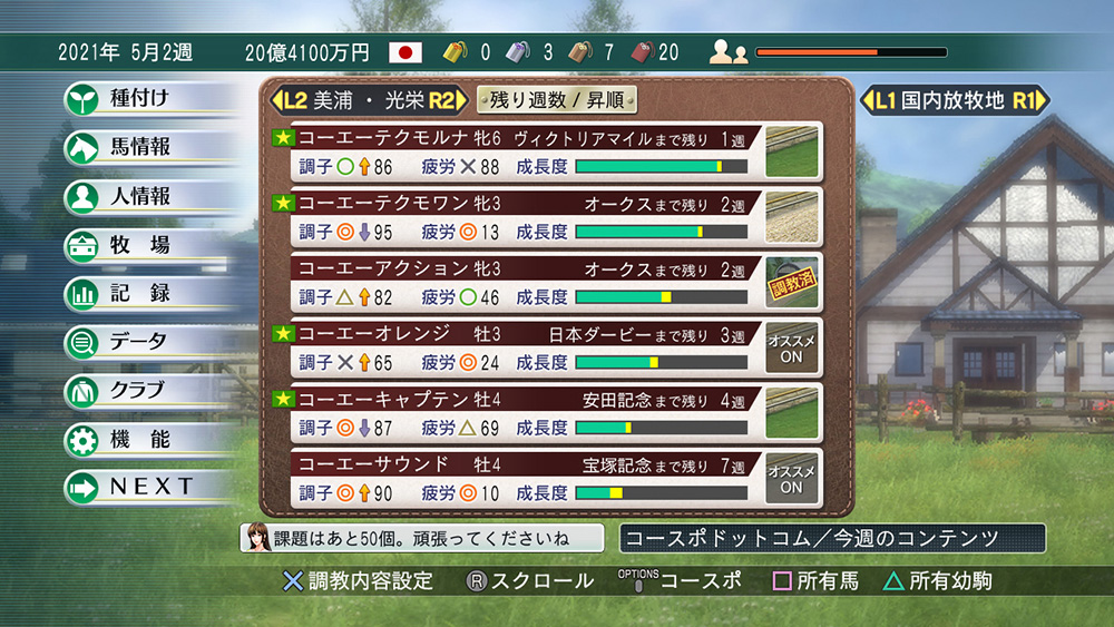 この画面から競走馬の調子、疲労、次走までの週数を確認できます。