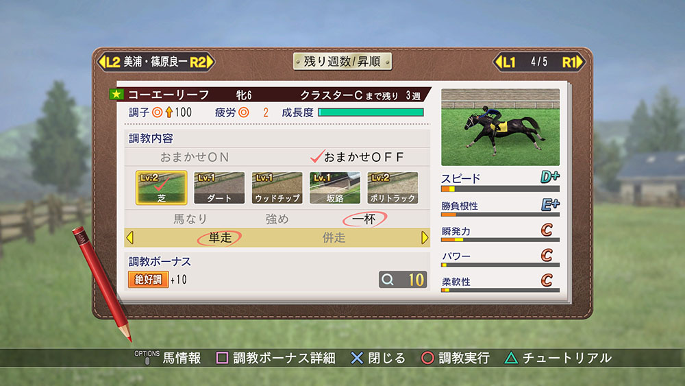 調教では、調教コースと調教の強さ、併せ馬の有無を設定できます。