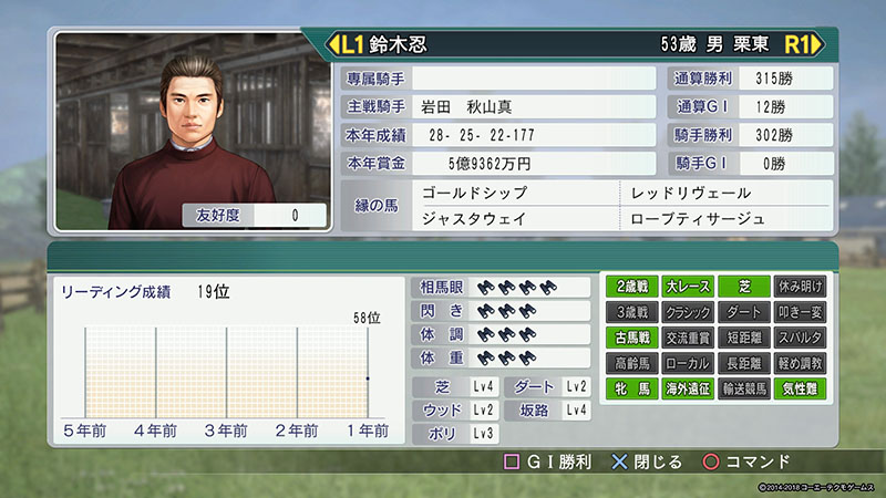 調教師の方々にはそれぞれ得意な能力や特性がありますが、本作ではさらに、調教の「コースレベル」が追加されました。芝やダートなど、調教師の得意なコースを選ぶと、より調教に力を発揮します。