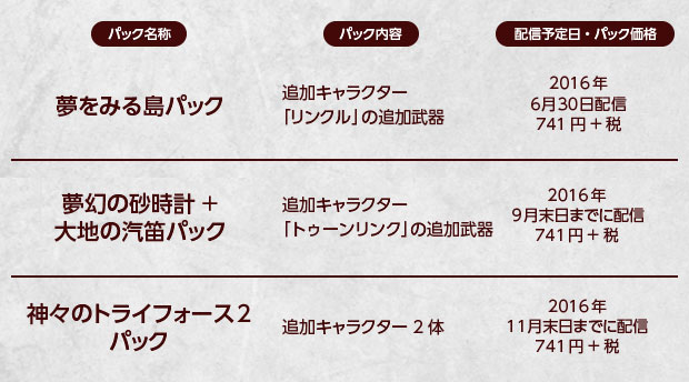 | 以下の3種の追加コンテンツでそれぞれ追加キャラクター「トゥーンリンク」が使用できるようになりますが、追加武器はそれぞれ異なります。追加コンテンツごとの追加武器につきましては、下記追加コンテンツの内容をご確認ください。 | ||