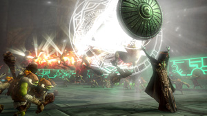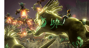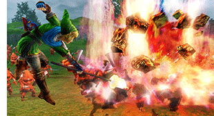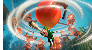 『ゼルダの伝説 トワイライトプリンセス』でリンクを助けたアイテム「スピナー」が、『ゼルダ無双』では敵を気持ちよく吹き飛ばす武器として生まれ変わりました。 |
