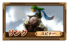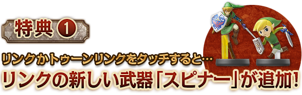 「ゼルダの伝説」シリーズのキャラクターをタッチした時に手に入れられる武器はゲーム内で取得済みの中からランダムで選ばれます。 リンクを初めてタッチした時のみ武器「スピナー」が新しく追加されます。 |