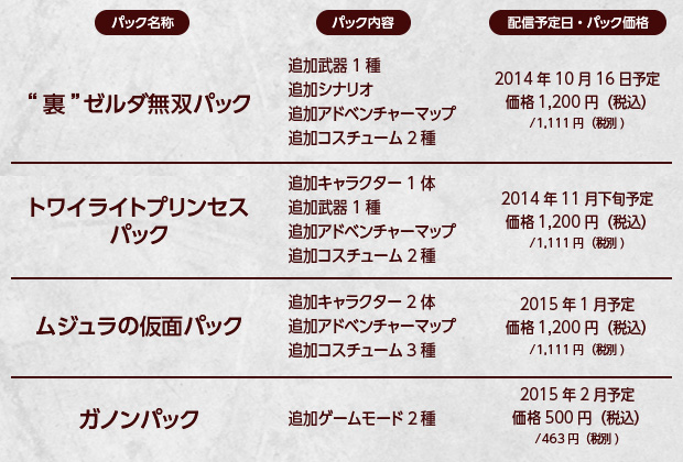 今後、予定されている4つの有料追加コンテンツパックを2014年9月30日よりまとめて予約購入することができます。 予約購入いただくと、その日から追加コスチューム「ダークリンク」を使えるようになります。 さらに、2014年10月16日配信予定の「“裏”ゼルダ無双パック」の内容が先行してプレイ可能になります。 |